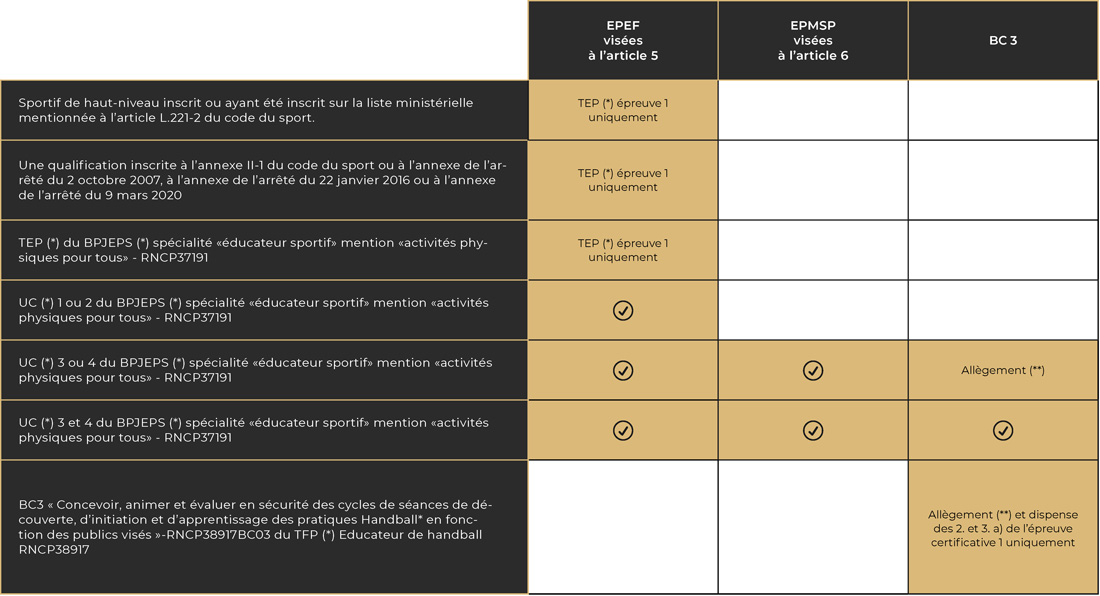 ELe titulaire de l’une des certifications mentionnées dans la colonne de gauche du tableau figurant ci-après est dispensée du(es) test(s) technique(s) préalables à l’entrée en formation et/ou obtient les blocs de compétences (BC) correspondants du BPJEPS spécialité « éducateur sportif » mention « multi-activités physiques ou sportives pour tous », suivantes :