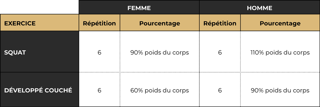 La performance exigée au test navette de « Luc Léger » correspond à la validation du palier n°6 (annonce du palier n°7) pour les femmes et à la validation du palier n°8 (annonce du palier n°9) pour les hommes.