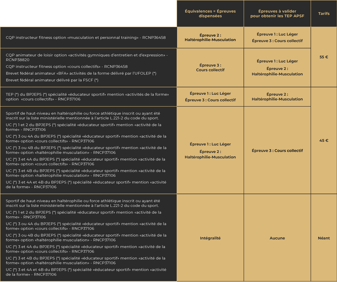 Pour entrer en formation BPJEPS «Activités Physiques et Sportives de la Forme» et «Multi-Activités Physiques ou Sportives pour Tous», chaque candidat doit satisfaire aux tests d’exigences préalables à l’entrée en formation (TEP).